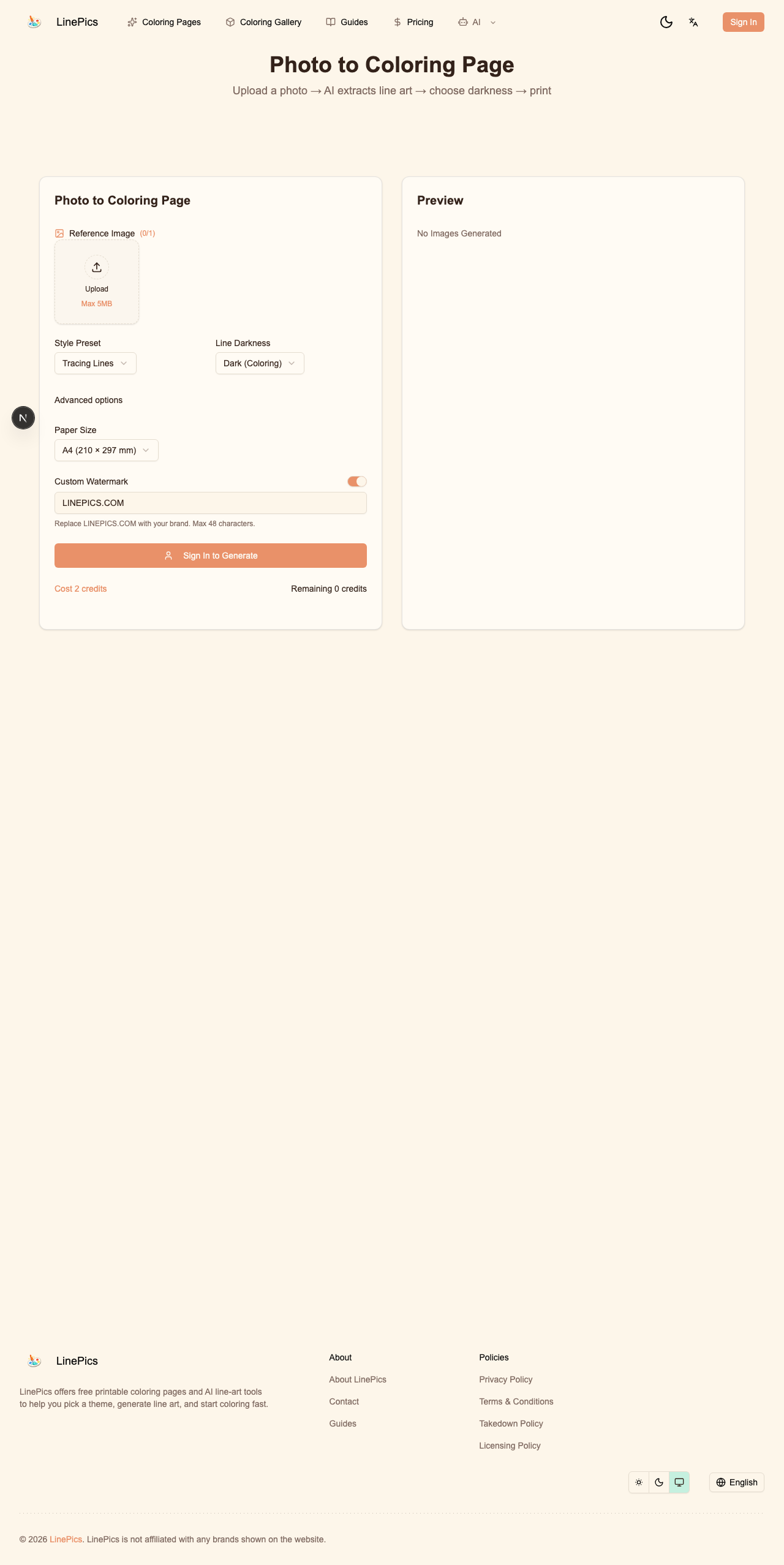 LinePics AI one-click generate coloring pages, supporting photo to coloring page, text to coloring page, and coloring page to reference coloring guide.